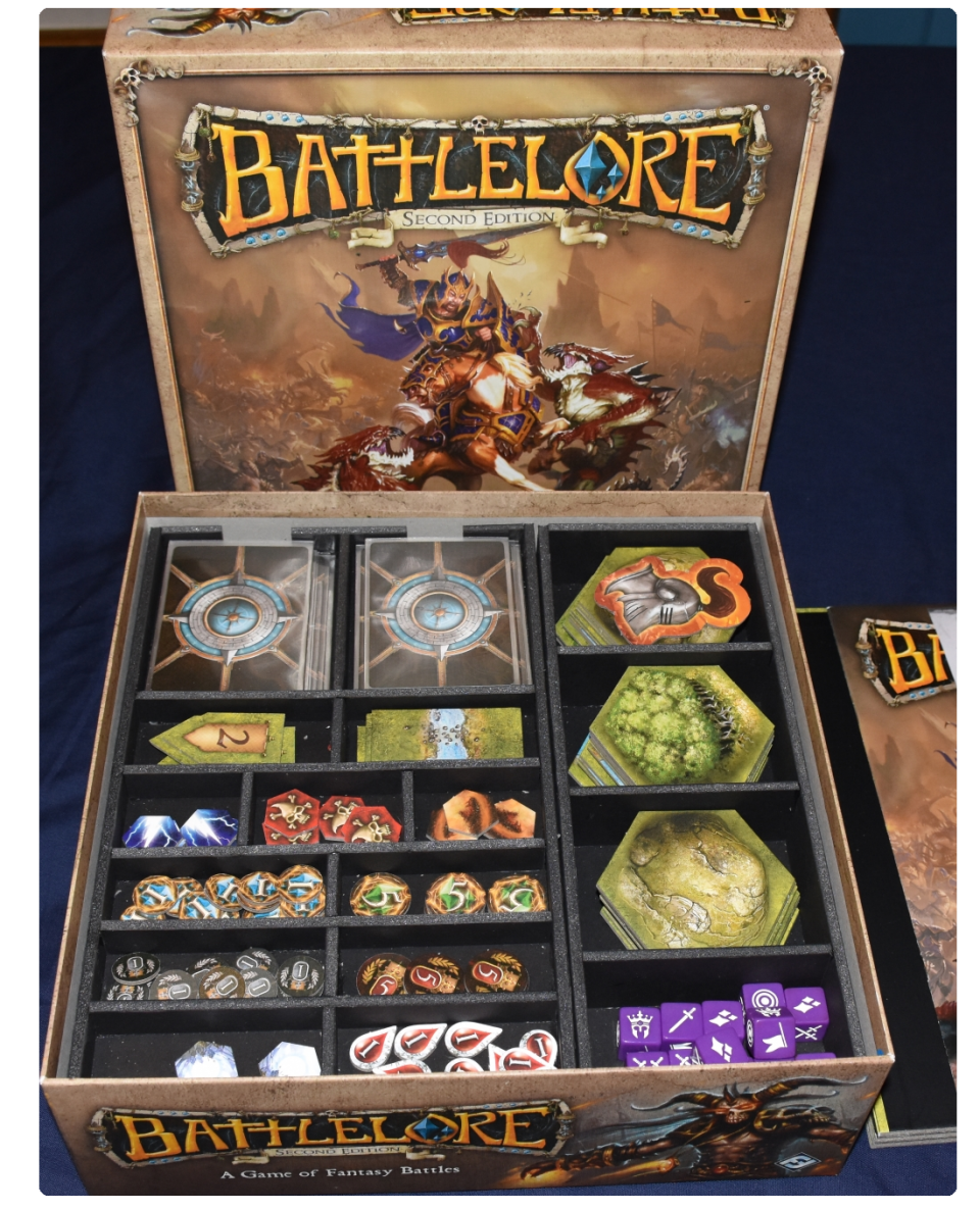 This listing is for Battlelore (2nd edition), published by Fantasy Flight Games, and the "Insert Here" storage system. All cards are sleeved. The insert holds the base game and accommodates premium sleeved cards. The storage system is designed via five removable trays. Two of them house each of the factions (Uthuq and Daqan). Another tray is used to hold the hexes (and the first player token). One tray is used to hold the player cards, easily separated into two different groupings - one for each faction. The remaining tray helps organize all the remaining tokens. You can view more pictures of the insert here.