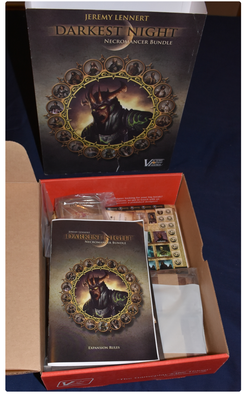 This listing is for Darkest Night (Necromancer Bundle). The Necromancer Bundle contains the Darkest Night base game plus Darkest Night: Nymph Promo, Darkest Night: On Shifting Winds, and Darkest Night: With an Inner Light. The game has been opened but all components remain unpunched and unwrapped. There is a slight tear in the sleeve that fits over the game (see picture). Components, however, are in new condition.