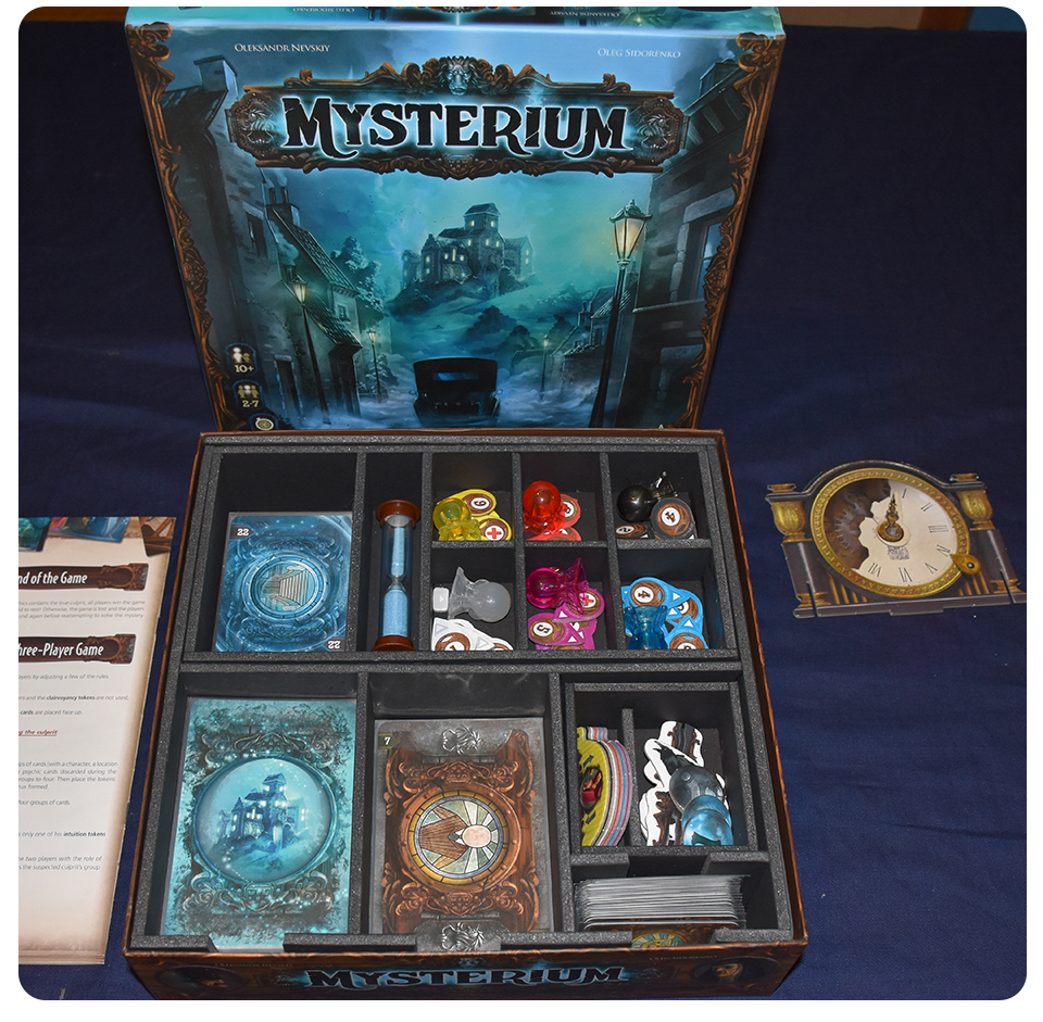 This listing is for Mysterium, from Asmodee, and comes with all of the cards sleeved. It also comes with the Insert Here storage system. Although not included, the insert will also hold the Hidden Signs expansion. The insert holds the larger cards with Mayday penny sleeves with the smaller and medium-sized cards sleeved with premium FFG sleeves. This insert comes with two removable trays to help with quick set-up and tear-down. More pictures of the insert can be viewed here.