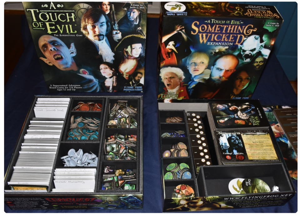 This listing is for Touch of Evil, the Something Wicked expansion, the Coast expansion, Hero Pack 1, Hero Pack 2, and the "Insert Here" storage system. The insert requires the use of (2) big boxes. Cards are unsleeved. The insert for the main box has (4) removable trays for components. The second box is mean to hold the manuals and large character/villain cards. (2) small trays are included for this box and fit around the map boards. You can view more pictures of the insert here.