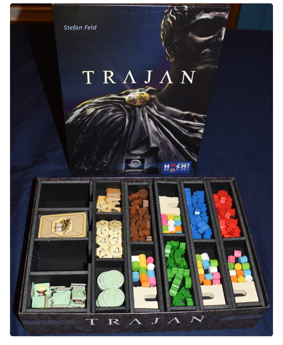 This listing is for Trajan, designed by Stefan Feld, and the "Insert Here" storage system (it also comes with all cards sleeved). The insert is composed of seven removable trays. Four of them cotain the players pieces for beginning-of-game start-up (one tray per person holding all their starting pieces). Another tray holds the cards (sleeved) with two empty spots reserved for the two discard piles. Another tray holds various components that are called to store near the board. The other tray will hold the remaining pieces used to set-up the game. More pictures of the insert can be found here.