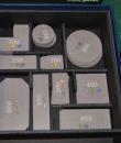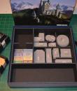 This insert is designed to hold sleeved cards. The main inserts has (4) removable trays. Two of them, the bank and card trays, are designed to remove and actually place on the board for quick set-up and tear-down. The main tray is designed so that a future tray can be placed on top so as to accommodate the possibility of expansions.