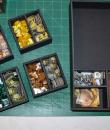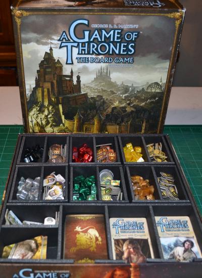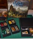 This insert is designed to hold the base game and the (2) expansions (Feast for Crows and Dance with Dragons). It comes with (6) inner trays each designed to hold each individual's player pieces. Therefore, all you need to do is hand people their tray to get started. The insert was designed to hold non-sleeved cards.