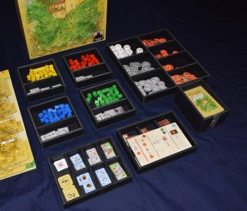 La Granja is a wonderful game published by Stronghold Games. The storage system comes with eight removable trays. Four of them are set up and ready to be distributed to each player (up to 4 players). There are two trays that can be placed easily by the board for easy set-up as well as an additional two trays to help organize the various other components that are to be placed on the game board.