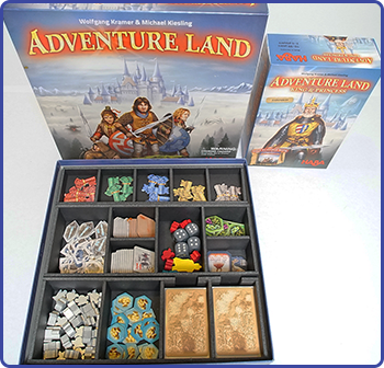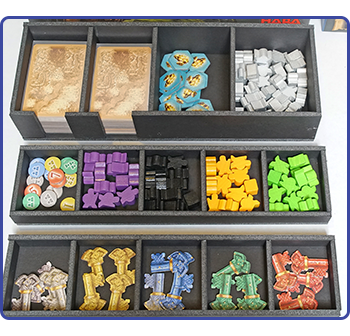 This storage system is composed of four removable trays and will hold sleeved cards. It fits the base game and the King and Princess expansion. Each of the invididual expansions within both the base game and King and Princess can be seperated very easily into this storage system so as to make setting up and customizing each game extremely easy. You can view more pics of the storage system here.